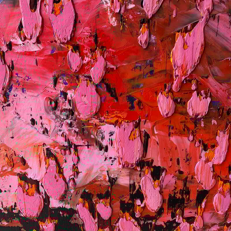 Layers and layers of oil paint have been applied to the canvas, the result of feeling rather than thinking, with colours colliding and occurring in an uncontrolled manner. The painting achieving a sense of depth, with fantastic detail hidden and exposed to varying degrees- ‘a joy to own and live with’.